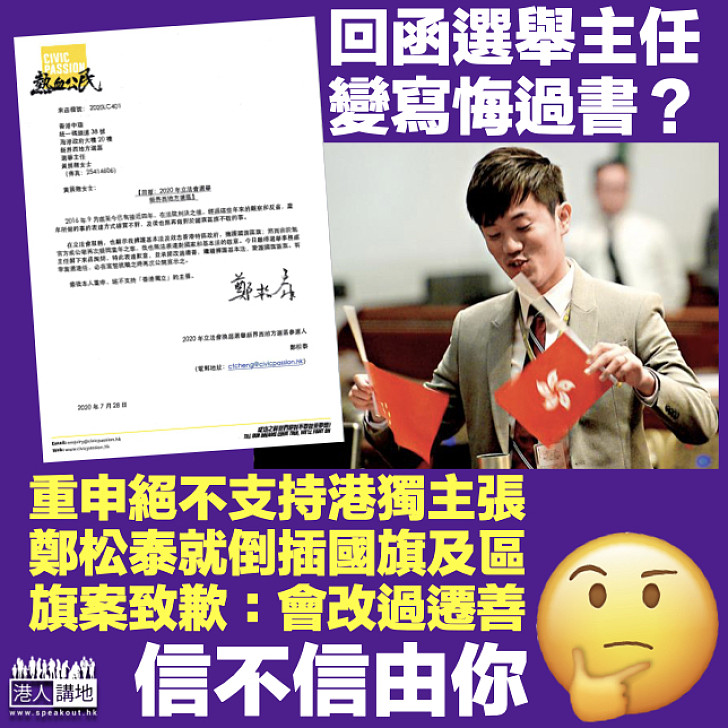 忽然懺悔 回覆選舉主任重申絕不支持港獨熱血公民鄭松泰就倒插國旗及區旗案致歉 承諾改過遷善 港人花生 港人講地